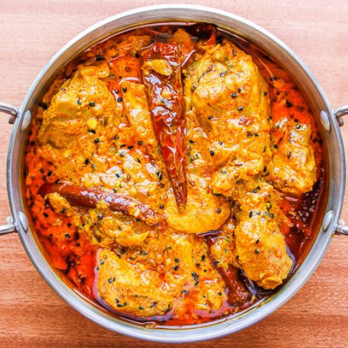 £7.50(Chicken or lamb) An authentic tangy preparation of curry, flavored with pickled spices and tomatoes.